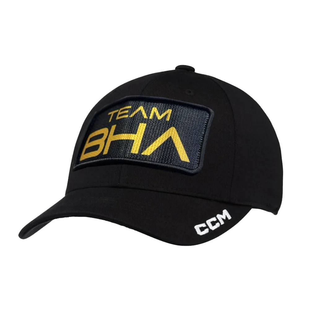 Nový model kšiltovky CCM x TEAMBHA, která má zahnutý kšilt a velké zlaté 3D logo TEAMBHA.